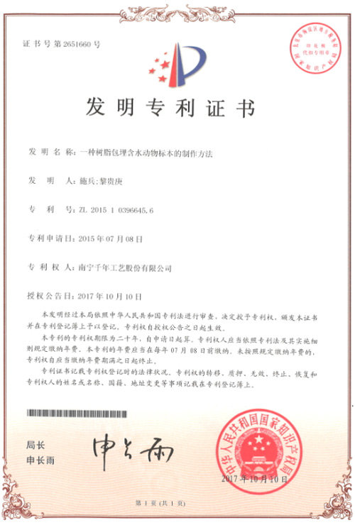 《一種樹脂包埋含水動物標本的制作方法》該發(fā)明提供了一種樹脂包埋含水動物標本的制作方法。千年工藝生產(chǎn)的“千帆”品牌包埋標本采用該發(fā)明的技術方案,使得包埋在樹脂中的標本形態(tài)顏色逼真,標本表面沒有起霧等質量問題;包埋樹脂沒有起霧,渾濁現(xiàn)象;樹脂透明度高,能夠清晰觀察到標本各個細節(jié);長時間使用,樹脂不變黃,標本不腐敗。